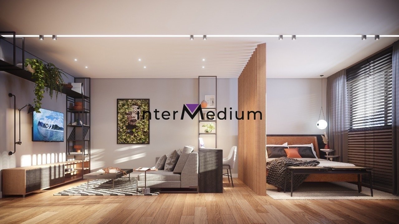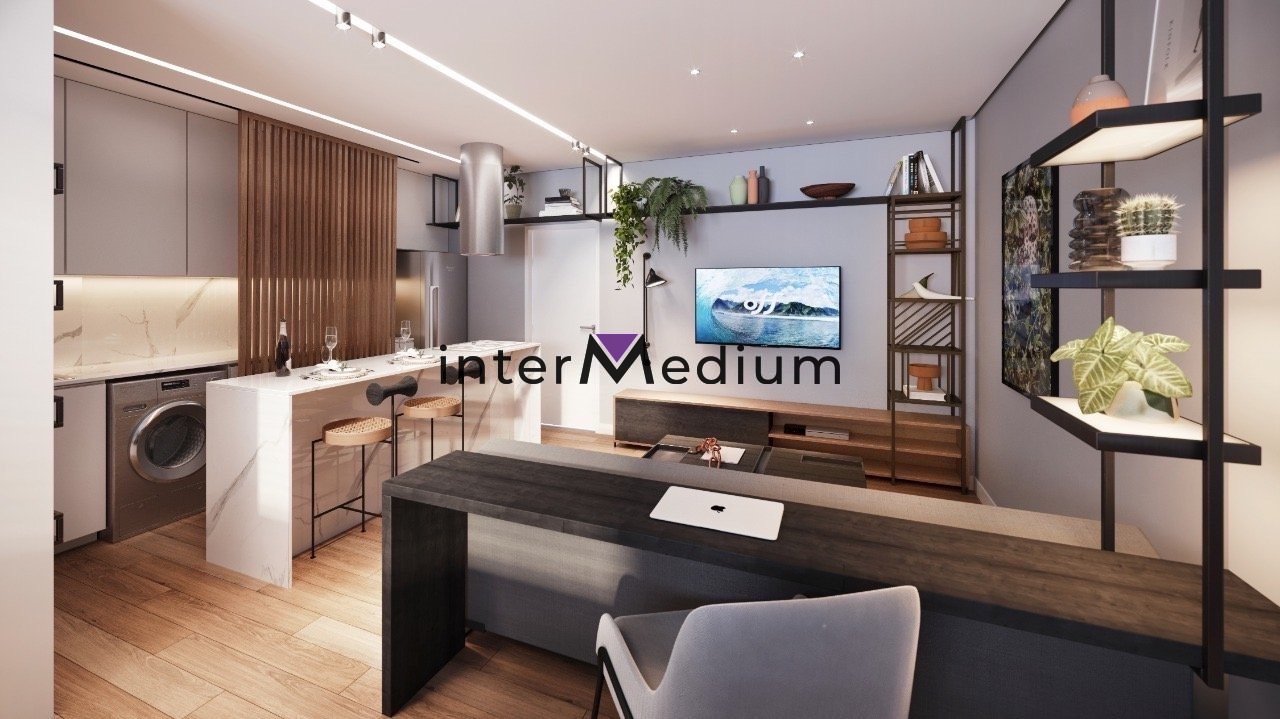 Os apartamentos-studio têm área de 32,43m² a 37,45m². Possuem ambientes integrados, sala e quarto com piso vinílico amadeirado, banheiro com piso em porcelanato e bancada em granito. Na cozinha americana há ilha com previsão elétrica para cooktop.