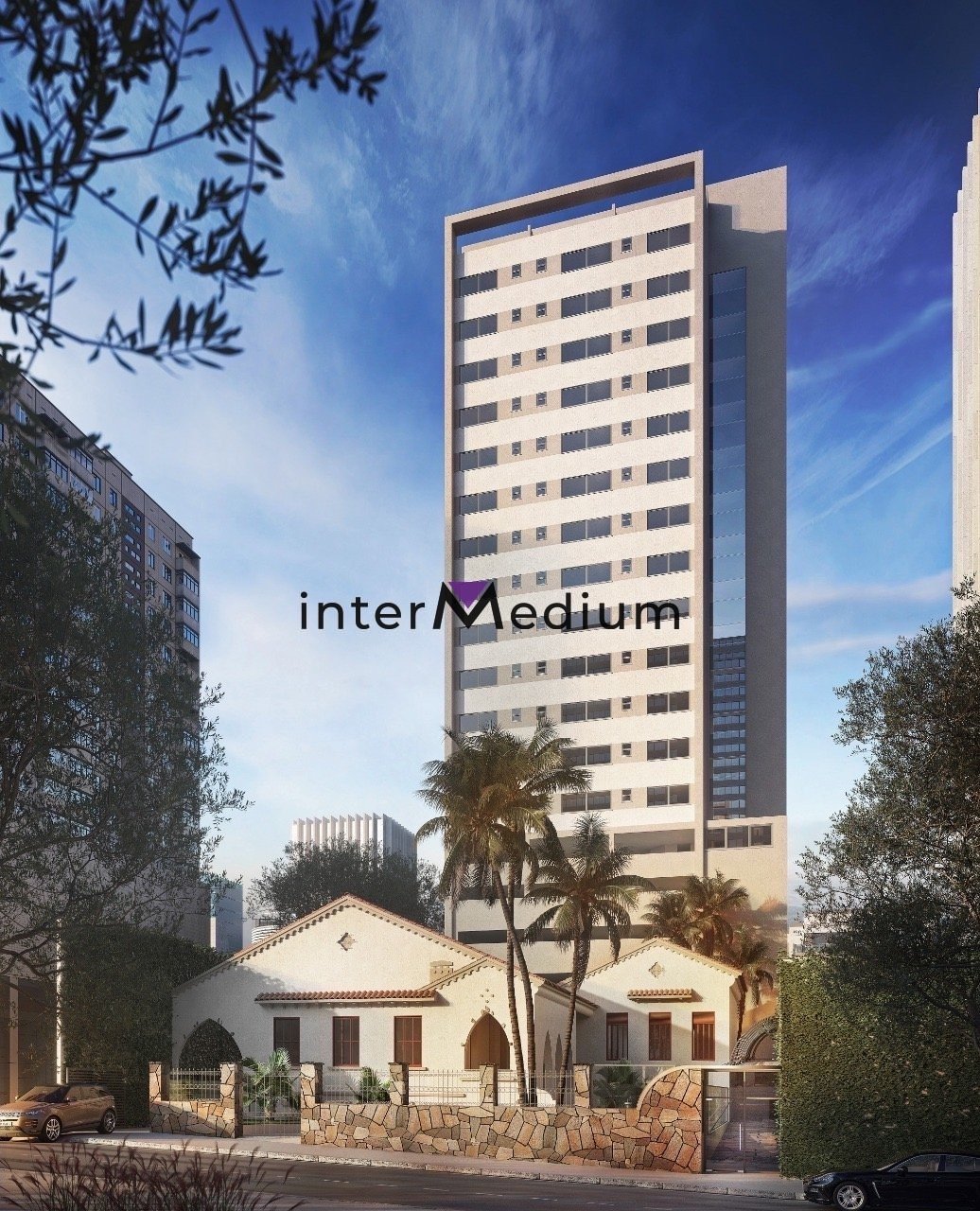 O empreendimento residencial Villa Almeida Ramos oferece apartamentos-Studio em um edifício sofisticado, com torre recuada no terreno e uma casa tombada frontal.